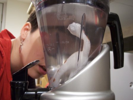 In May 2005, I put a giraffe in a water bottle. It was one of those giraffes that claims to grow 600 times its original size in 72 hours. 72 hours later they were absolutely correct! The giraffe had grown so much it took the shape of the water bottle it had been encased in. Supposedly the giraffe should have shrunk back to its original size if left out of the water...but I wasn't ready for that just yet. Instead I woke up in the middle of the night, having just dreamt about the giraffe yelling at me that it "had a crink in its neck" (inanimate object are often very animate in my dreams...ho-hum, can't imagine why!) I got out of bed and at 2am cut the water bottle in half to revive the squished giraffe and looked for the next largest water container I had in the house. It just so happened that the next largest water container was my fancy blender. Here's what it looked like at that point: